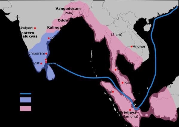 9-ம் நூற்றாண்டில் “மணிக்கிராமம்” என்னும் தென்னிந்திய வர்த்தகக் குழு வங்கக்கடலைக் கடந்து எதிர்க் கடற்கரை ஓரத்தில் இயங்கத் தொடங்கிய செய்தியை அங்குள்ள தகுவாபா என்னுமிடத்தில் உள்ள கல்வெட்டு ஒன்று கூறுகிறது. பண்டைய வழக்கப்படியே சோழர்களும் தங்கள் கடல் ஆதிக்கத்தைப் பரப்பும் பணியில் ஈடுபட்டு பல வெற்றிகளைக் கண்டனர். ஈழம், மாலைதீவு ஆகியவற்றைக் கைப்பற்றியது. சீன வரலாற்றில் குறிக்கப்பெற்றது போல, சீன நாட்டிற்கு தூதுக்குழுவை அனுப்பியது.