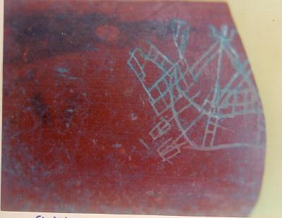 இங்கு கப்பல் உருவம் வரையப்பட்ட பானை ஓடு ஒன்றும், அச்சில் பதிக்கப் பெறுவதற்காகக் குடையப்பெற்ற காளை உருவத்தோடு கூடிய பானை ஓடு ஒன்றும், யானை ஓன்று செடியைத் தும்பிக்கையால் வளைத்து உண்ண முயல்வது போன்ற உருவம் பொறிக்கப்பட்ட பானை ஓடு ஒன்றும் கிடைத்துள்ளது.