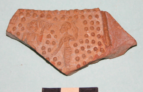 கிரேக்க கலைப்பாணியை ஒத்துள்ள, ஒரு பெண் தன் குழந்தையை இடுப்பில் தாங்கி உள்ளதைப்போன்று சுடுமண் பொம்மை கண்டெடுக்கப்பட்டுள்ளது. மற்றொரு பானை ஓட்டில் மூன்று பெண்கள், விசிறியை தம் கைகளில் கொண்டும், ஒரு கையில் மதுக்குடத்தைத் தாங்கியும் காணப்படுகின்றனர். இவை எகிப்து பிரமீடுகளில் உள்ள வண்ண உருவங்களை போன்று உள்ளன.