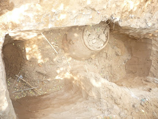நிலத்தில் வெளிப்பட்டு நிற்கும் முதுமக்கள் தாழி